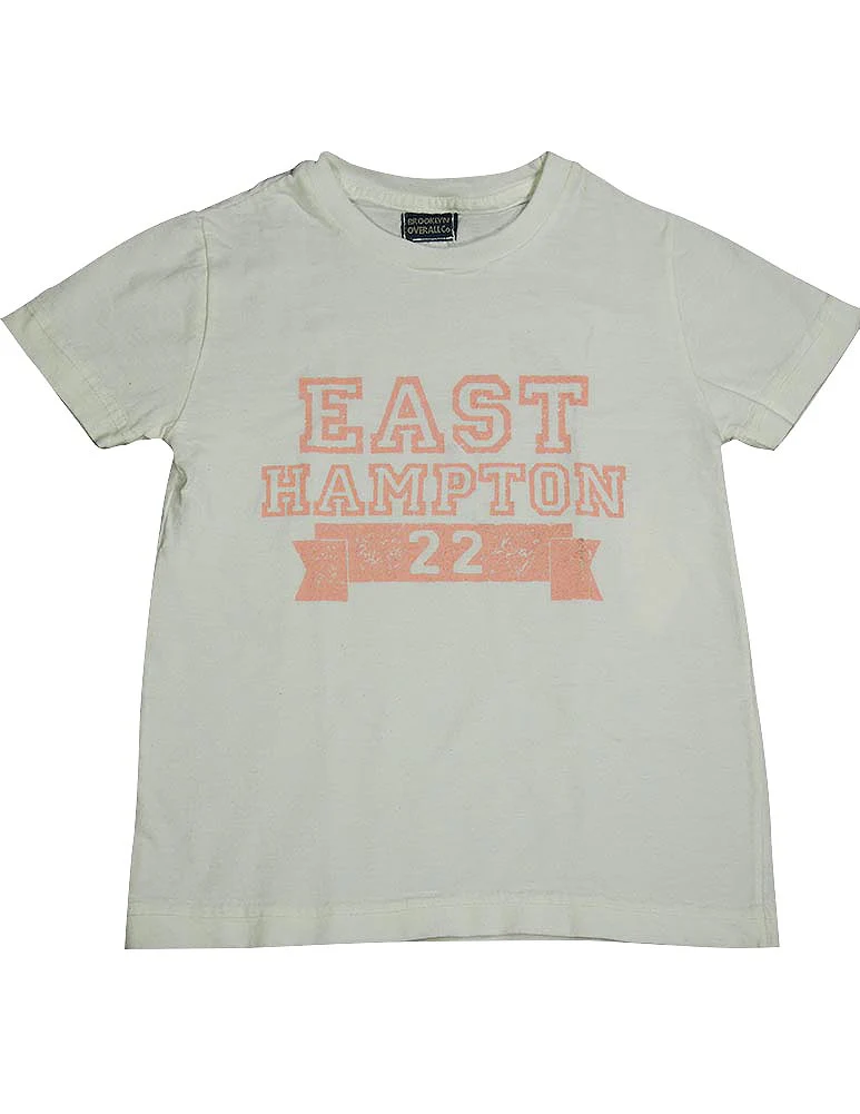 Brooklyn Overall - Girls Tee Top - White, Short Sleeve T-Shirt, 'East Hampton 22' on Front in Pink, 90% Cotton, 10% Polyester, Machine Wash #1398