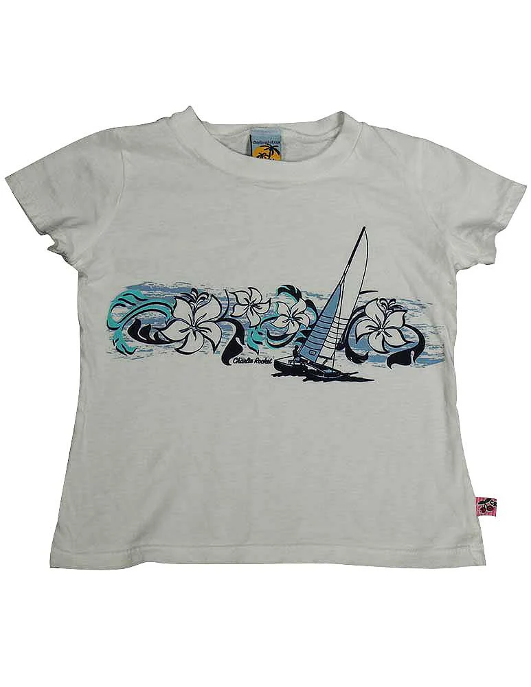 Charlie Rocket - Girls Short Sleeve Tee Shirt, White, Ribbed Neck, Screen Print Sail, 100% Cotton, Made In USA, #13327