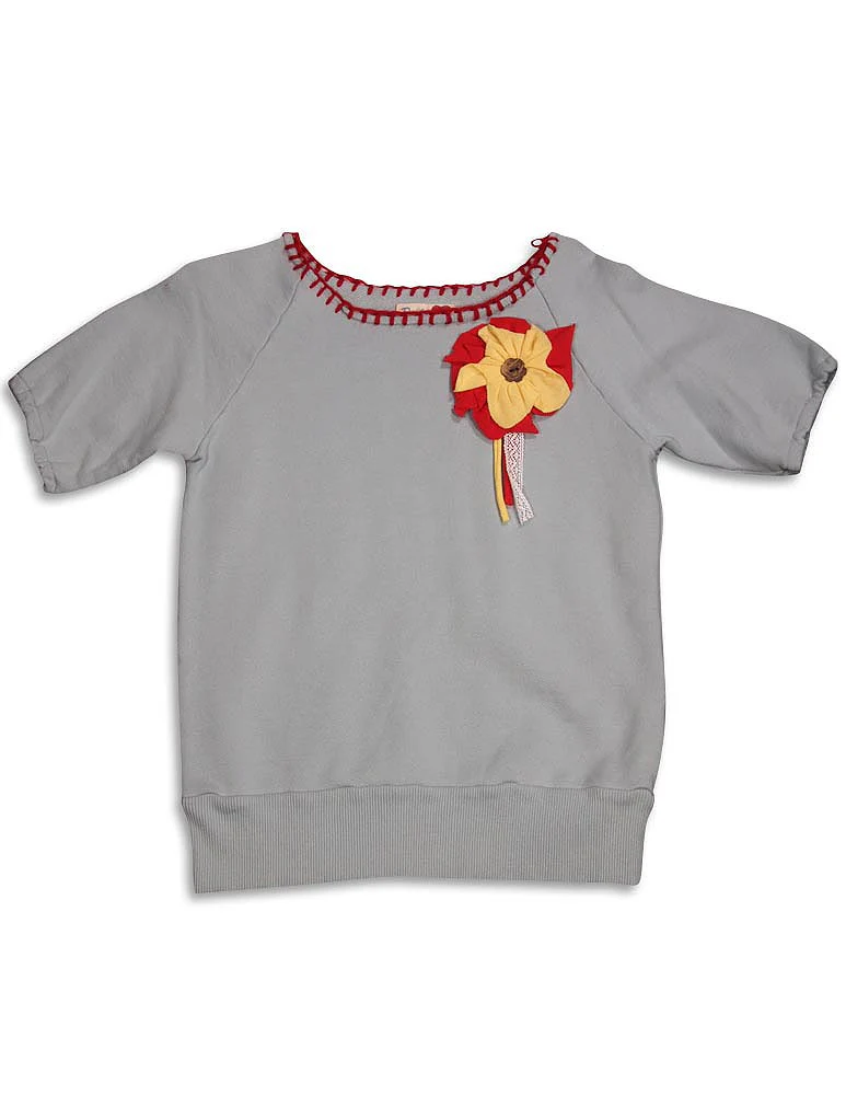Dinky Souvenir - Girls Short Sleeve Sweatshirt, Light Blue, Whipstitch Neckline Trim, Elastic Sleeve Bands, Ribbed Waistband, Three Dimensional Flower Applique, 100% Cotton, Made In China, #31187 31-187