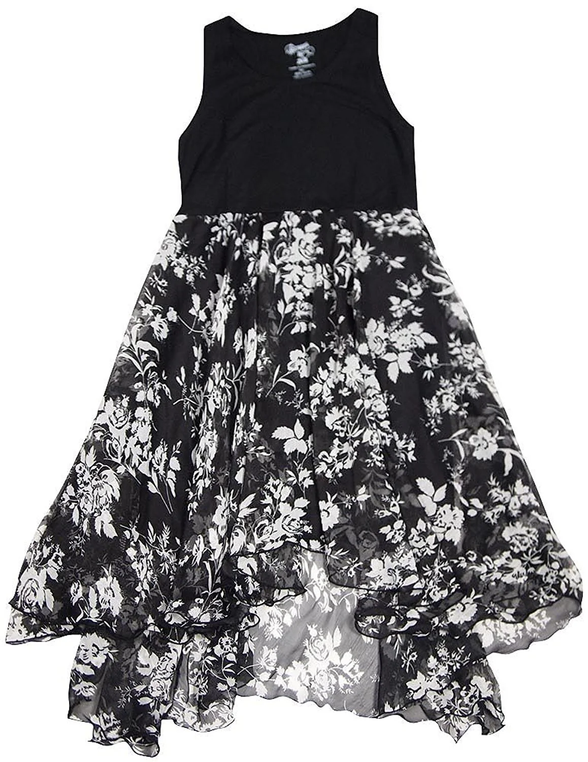 Flowers by Zoe - Girls Sleeveless Floral Dress, Scoop Neck, Stretch Bodice, Sheer Floral Skirt Overlay, Hi Lo Hem, Lining Under Skirt, Bodice 85% Rayon 15% Spandex Skirt 100% Polyester, Made in Indonesia, #33131