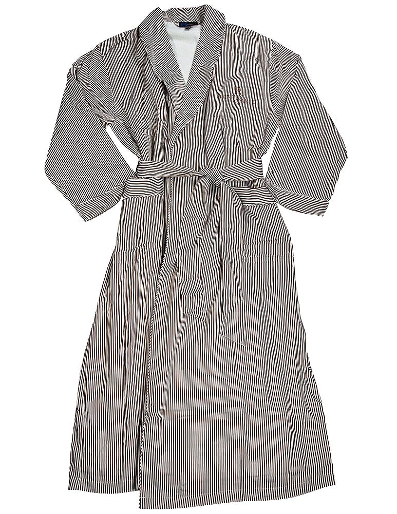 Majestic International - Mens Long Sleeve Striped Spa Robe, Brown, White, One Size Fits Most, Terry Cloth Lining, Shawl Collar, Piping Trim, Tie Belt, Front Pockets, Hotel Logo Emblem, Approximately 52 Inches from Shoulder to Hem, Shell 100% Cotton, Lining 80% Cotton 20% Polyester, Made in China, #36676 36-676