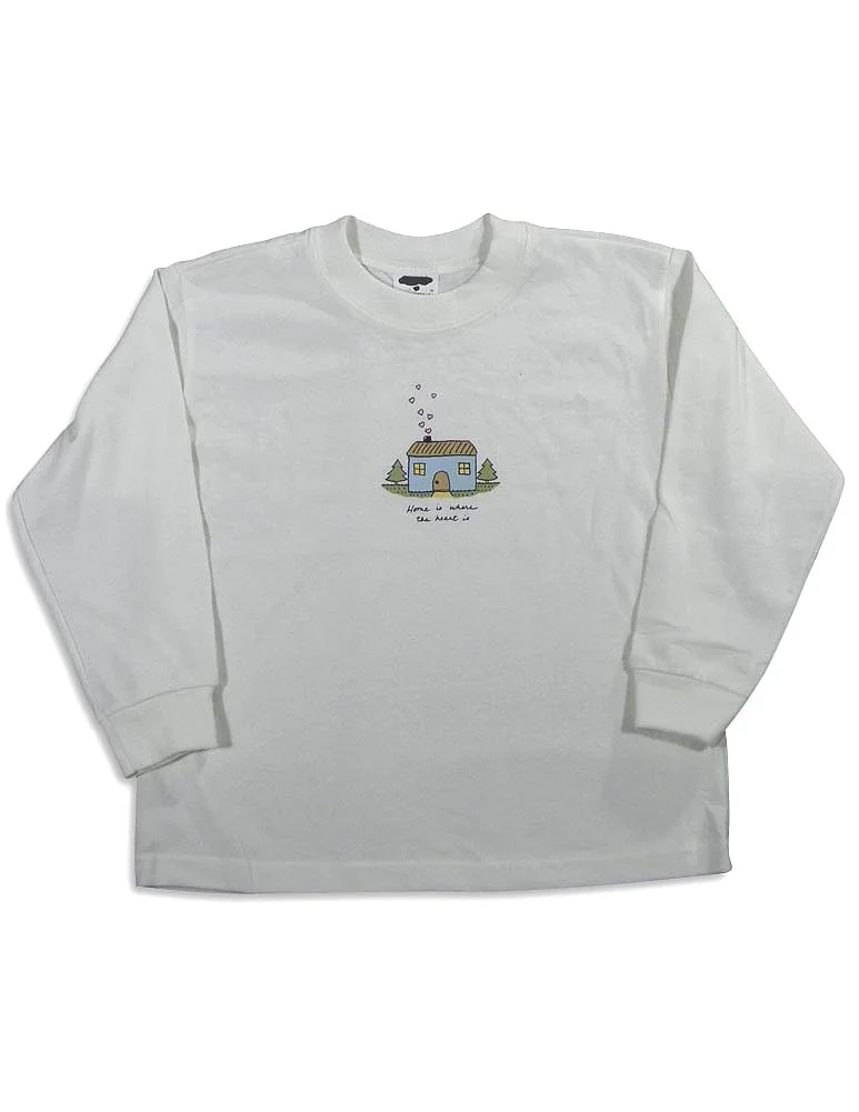 Mulberribush - Girls Long Sleeve House Shirt, Cream, Ribbed Neck, Cuff Wrists, Screen Printed House Graphic, HOME IS WHERE THE HEART IS, Full Cut Body, 100% Cotton, Made In USA, #26918 26-918